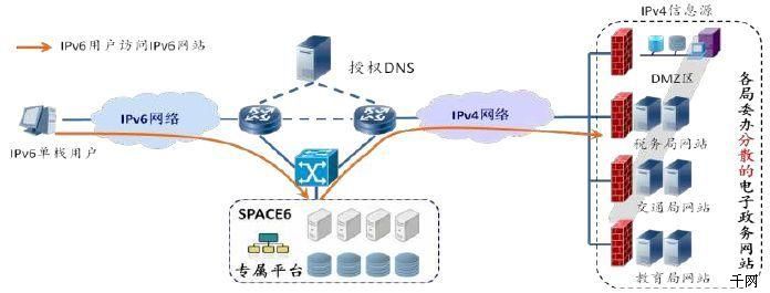 SPACE6應用遷移技術適用于下一代互聯網網絡和業務發展領域,可解決IPv4網絡和IPv6網絡的內容互通問題,可協助互聯網ICP、政府、高校、企業等機構在不修改現有網站系統的情況下,快速完成現有IPv4網站向IPv6網絡的遷移。通過該技術,IPv6用戶可以訪問IPv4網站內容,IPv4用戶也可以訪問IPv6網站內容,并同時支持IP訪問和域名訪問。從而在一定程度上解決了因為IPv4網站短時間內無法轉換成IPv6網站,而導致的IPv6應用匱乏、IPv6網絡發展受阻的問題,并避免IPv4網絡和IPv6網絡對接過程中,對網絡設備的依賴性,保證IPv4和IPv6主機之間的無縫互通。